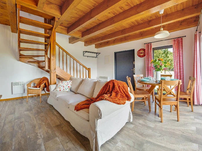 Przestronny salon z wygodnymi meblami i dostępem do telewizji sprzyja relaksowi po dniu spędzonym na świeżym powietrzu, a dwupoziomowy układ apartamentu zapewnia poczucie przestrzeni i prywatności. W sypialniach znajdują się komfortowe łóżka z pościelą, gwarantujące spokojny sen, a w łazience – prysznic, ręczniki oraz podstawowe środki czystości. Dodatkowym udogodnieniem jest przypisane miejsce parkingowe oraz możliwość pobytu z pupilem w wybranych apartamentach.