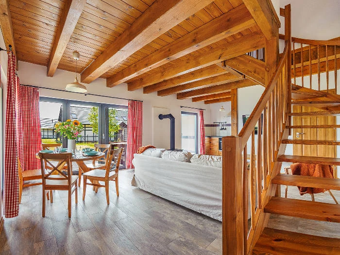 Przestronny salon z wygodnymi meblami i dostępem do telewizji sprzyja relaksowi po dniu spędzonym na świeżym powietrzu, a dwupoziomowy układ apartamentu zapewnia poczucie przestrzeni i prywatności. W sypialniach znajdują się komfortowe łóżka z pościelą, gwarantujące spokojny sen, a w łazience – prysznic, ręczniki oraz podstawowe środki czystości. Dodatkowym udogodnieniem jest przypisane miejsce parkingowe oraz możliwość pobytu z pupilem w wybranych apartamentach.