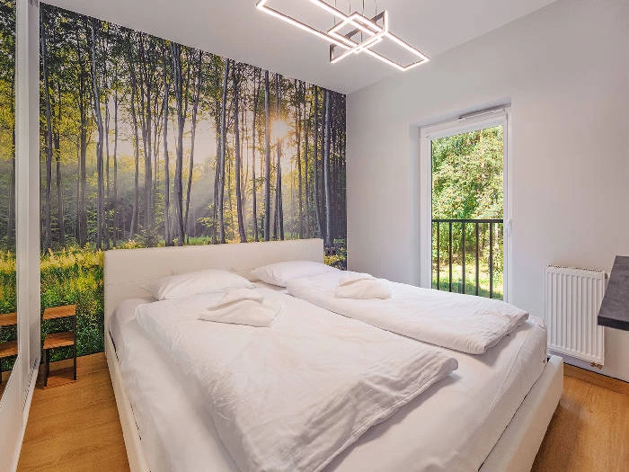 Przestronny salon zaprasza do relaksu na wygodnych meblach, z dostępem do telewizji i internetu. W sypialni czekają komfortowe łóżka z czystą pościelą, które gwarantują spokojny sen po dniu spędzonym na Mazurach. W łazience znajdziesz prysznic, ręczniki i podstawowe środki czystości, a przypisane miejsce parkingowe oraz możliwość przyjazdu z pupilem w wybranych apartamentach dodatkowo podnoszą komfort pobytu.