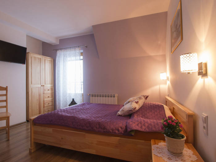 Zatrzymacie się w standardowym 4 os. pokoju, który zapewni wszystkie niezbędne udogodnienia: duże łóżko, TV, Wifi, balkon z widokiem na góry (nie we wszystkich pokojach) oraz łazienkę z prysznicem i zestawem ręczników. Na miejscu są dostępne miejsca do grillowania, szałas z kominkiem i izba regionalna.