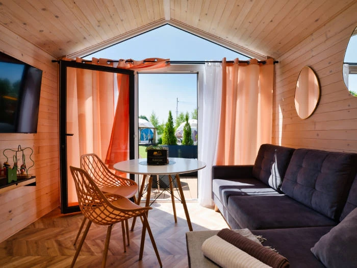 Domki Exclusive zapewniają wysoki standard i pełną niezależność podczas pobytu. Wnętrza obejmują salon z rozkładaną sofą, sypialnie z wygodnymi łóżkami, łazienkę z prysznicem oraz funkcjonalny aneks kuchenny wyposażony w sprzęty do przygotowywania posiłków. Goście mogą korzystać z klimatyzacji, Wi-Fi, telewizji, ekspresu do kawy i zestawu do parzenia napojów. Dodatkowym atutem jest prywatny taras, często z grillem lub jacuzzi, który pozwala cieszyć się relaksem w kameralnej atmosferze.