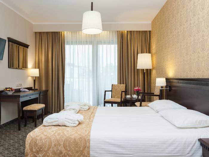 - pokój Standard - wygodne łóżka, WIFI, telewizję satelitarną, sejf, wodę mineralną, klimatyzacja, kapcie oraz łazienkę z prysznicem lub wanną, ręcznikami, kosmetykami, szlafrokami i suszarką do włosów.